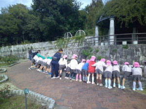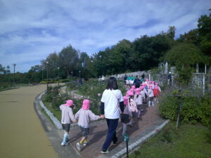 11月4日、俊英舘保育園・俊英舘第2保育園のきりん組・ぞう組(4・5歳児)のみんなで、秋の散歩に鶴見緑地へ出かけました。