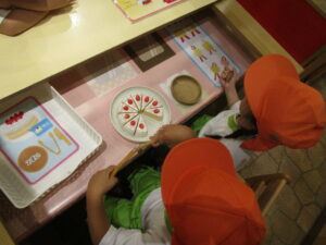子どもたちは音を鳴らしたり、衣装を身につけたりと、五感を使って楽しんでいました。